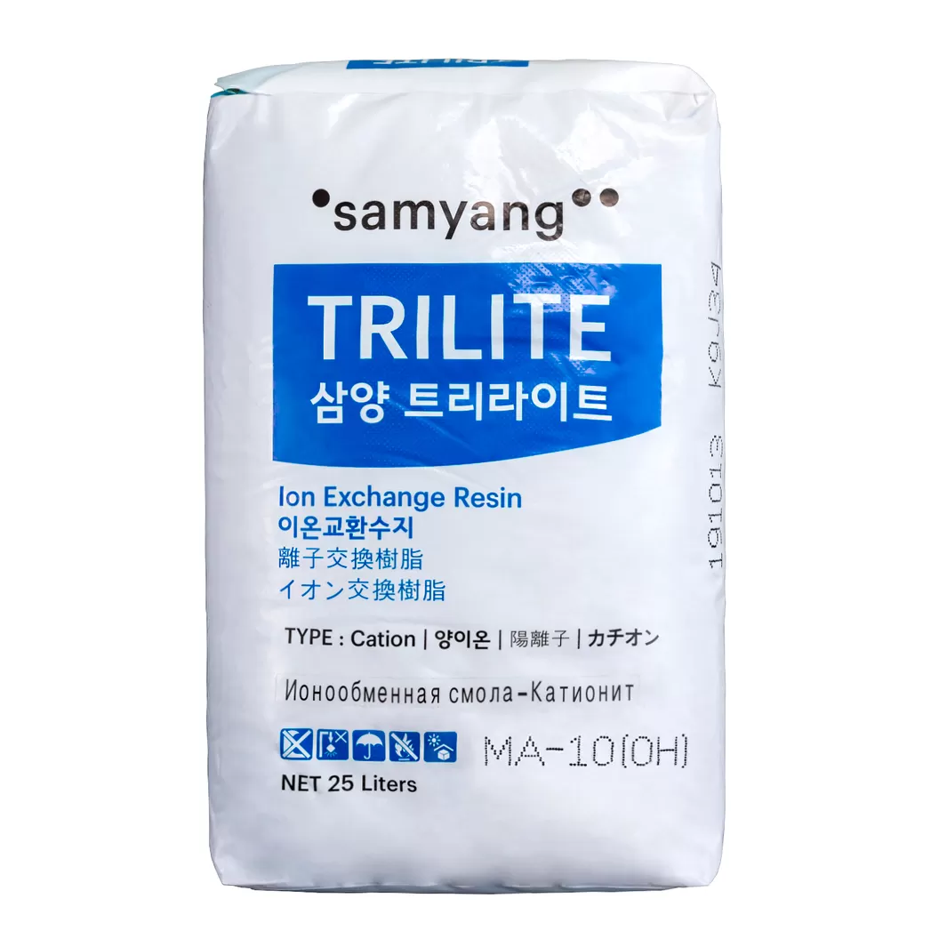 - TRILITE MА-10 (ОН) - сильноосновная анионообменная смола, обладает высокой рабочей емкостью, отличной механической и химической стабильностью, высокой целостностью частиц. Данное свойство дает такие преимущества, как, например, более быстрая диффузия, механическая/химическая стабильность облегчает возможность осуществления противоточных процессов в фильтре. TRILITE MA-10(OH) – состоит из частиц размера 590 ± 50 ㎛.