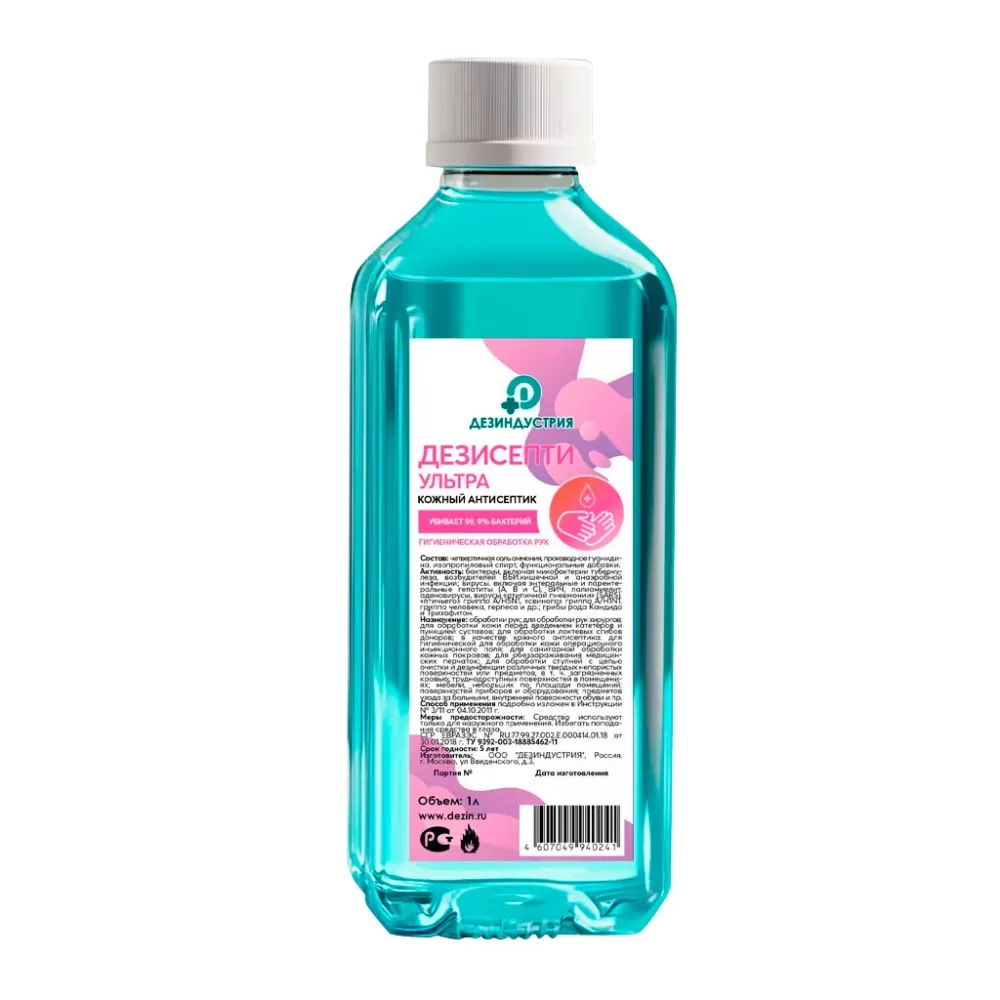 - спирт изопропиловый 36,5%, четвертичную соль аммония и производное гуанидина в качестве действующих веществ, а также вспомогательные компоненты, отдушку, краситель и воду.