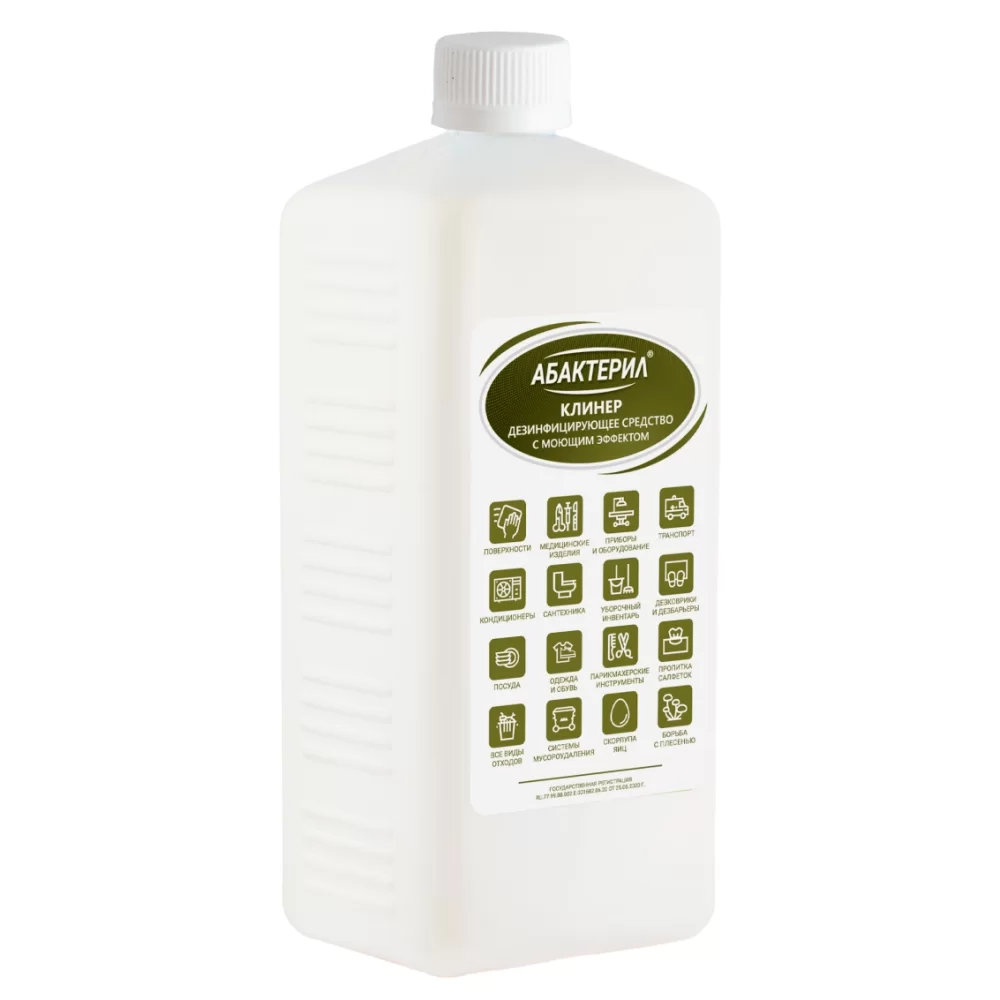 - Средство «Абактерил-клинер» обладает антибактериальной активностью в отношении грамотрицательных и грамположительных бактерий (включая микобактерии туберкулеза – тестировано на Mycobacterium terrae), возбудителей внутрибольничных инфекций (ВБИ) – тестировано на Pseudomonas aeruginosa, кишечных инфекций - бактерий группы кишечной палочки, стафилококков, стрептококков, в т.ч. метициллин-резистентный стафилококк и ванкомицин-резистентный энтерококк, сальмонелл, легионеллёза, анаэробных инфекций; вирусов (рино-, норо-, рото-, адено-вирусов, коронавирусов, вирусов энтеральных и парентеральных гепатитов (в т.ч. гепатита А, В, С), полиомиелита, энтеровирусов Коксаки, ЕСНО, ВИЧ-инфекций, вирусов гриппа и парагриппа человека, вирусов «атипичной пневмонии» (SARS), вирусов герпеса, кори, возбудителей ОРВИ, вирусов «свиного» гриппа H1N1 и «птичьего» гриппа H5N1, цитомегаловирусной инфекции и т.д.), фунгицидной активностью в отношении грибов рода Кандида и Трихофитон, плесневых грибов (тестировано на тест-штамме Aspergillus niger).