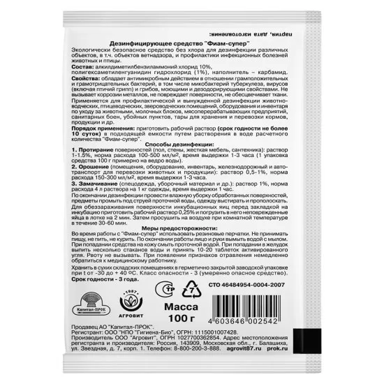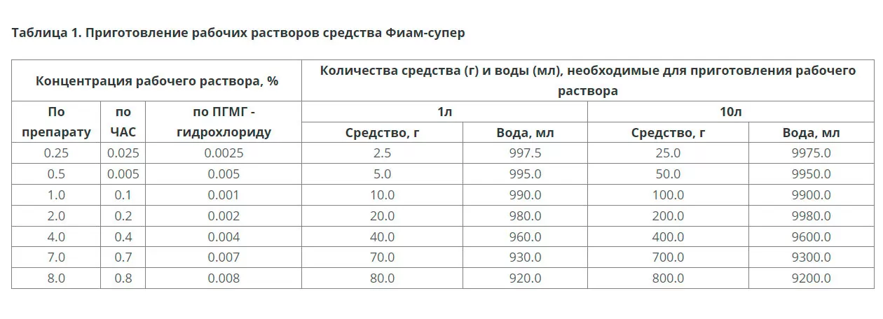 - Рабочие растворы готовят путем добавления соответствующих количеств Фиам-супер к водопроводной воде, принимая средство за 100% вещество.