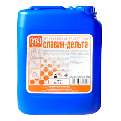 - Химический состав дезсредства Славин-Дельта: ЧАС, Альдегид, Гуанидин, Поверхностно-активные вещества (ПАВ), Вспомогательные компоненты