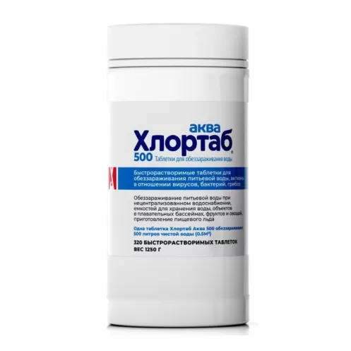 Дезинфицирующее средство Хлортаб Аква 500 для обеззараживания питьевой воды при нецентрализованном водоснабжении, в инфекционных очагах, по эпидпоказаниям, обеззараживание емкостей для хранения воды, объектов в плавательных бассейнах, обеззараживание фруктов и овощей, приготовление пищевого льда. 1 таблетка Хлортаб Аква 500 за 30 минут обеззараживает 500 литров воды. Обладает бактерицидным, вирулицидным и фунгицидным действием. Назначение: Обеззараживание питьевой воды при нецентрализованном водоснабжении, в инфекционных очагах, по эпидпоказаниям, обеззараживание емкостей для хранения воды, объектов в плавательных бассейнах, обеззараживание фруктов и овощей, приготовление пищевого льда. Применение: Инфекционные очаги, предприятия и организации, деятельность которых связана с обеспечением населения питьевой водой при нецентрализованном водоснабжении, предприятия общепита, отдыха и спорта (бассейны), населением в быту (особенно охотники, рыболовы. туристы). Состав: действующее вещество – натриевая соль дихлоризоциануровой кислоты. Количество: 320 штук.