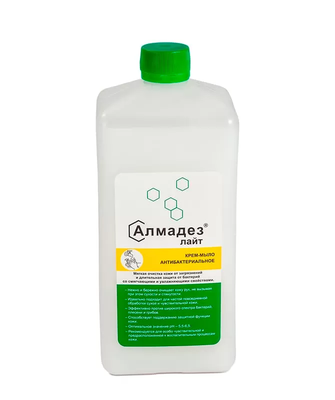 Крем-мыло антибактериальное «Алмадез-лайт» представляет собой гелеобразную жидкость белого цвета с легким запахом применяемой отдушки. Содержит антибактериальную добавку ундециленамидопропиллтримониум метосульфат (Тетранил У), в качестве моющей основы — комплекс ПАВ, в качестве умягчающей и ухаживающей за кожей добавки — глицерин, кокамидопропил бетаин и диэтаноламид кокосового масла.