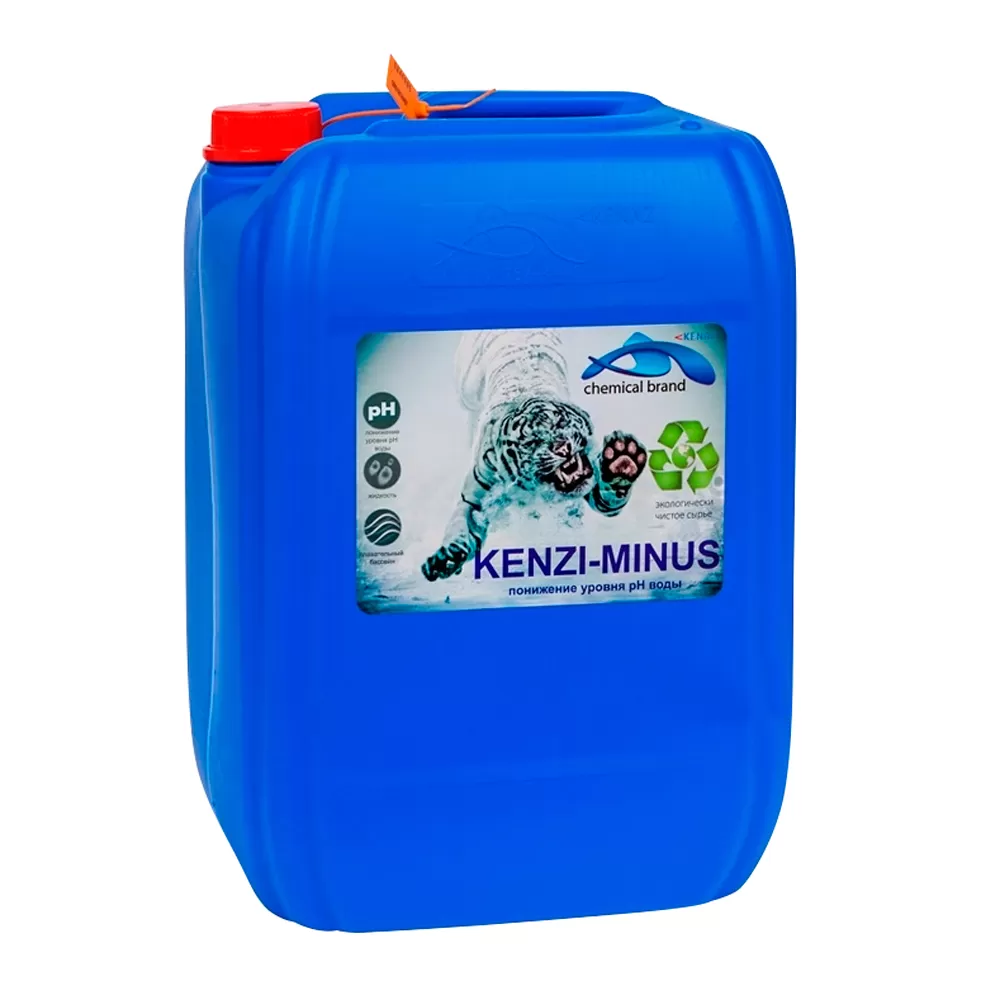 - Высокий уровень pH приводит к раздражению слизистой оболочки глаз, снижению естественной защиты кожи, вода известкуется, а также может появляться запах хлора. Для того чтобы понизить значение необходимо использовать солянокислый регулятор уровня pH Кензи-минус от производителя Kenaz. Содержит в составе соляную кислоту 14%.