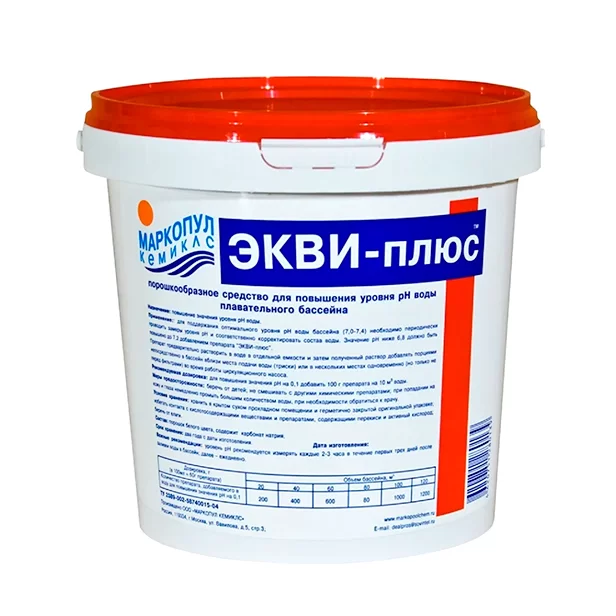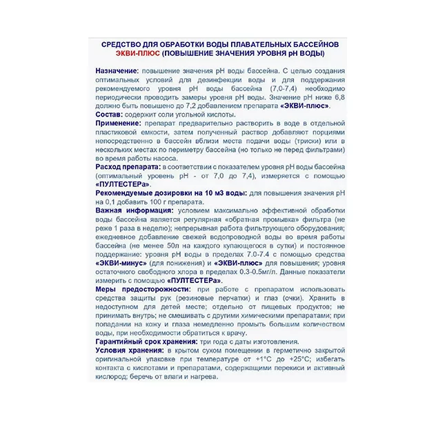 - рекомендуемые дозировки: для повышения значения рН на 0,1 добавить 100 мл (130 г) препарата на 10 м3 воды;