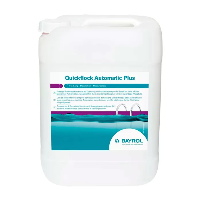 Применяется в частных бассейнах с высокой скоростью фильтрации. Присутствие лантана в составе данного средства гарантирует более качественный уход за водой и почти исключает необходимость добавления альгицида для чистки бассейна. Лантан - химический элемент, поглощающий фосфат. Фосфаты же являются причиной появления водорослей и помутнения воды в бассейне. Таким образом новая формула Куикфлок-Автомат с добавлением лантана предотвращает появление водорослей и борется с уже существующими загрязнениями. Применение: