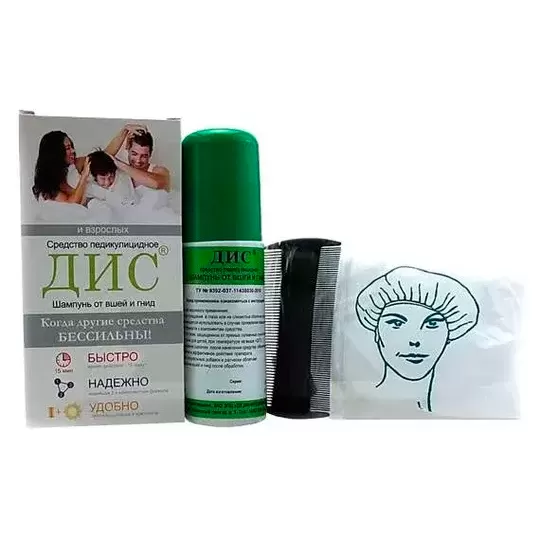 - Педикулицидный шампунь «Дис» быстро и эффективно уничтожает головные и лобковые вши, их личинки и яйца (гниды). Действует на резистентные популяции вшей, устойчивые к действию пиретроидных педикулицидов.