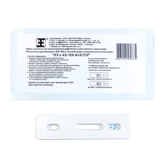 Один набор рассчитан на проведение одного определения наличия КК-МВ в цельной крови, сыворотке или плазме крови человека в клинико-диагностических и биохимических лабораториях, а также для самоконтроля.