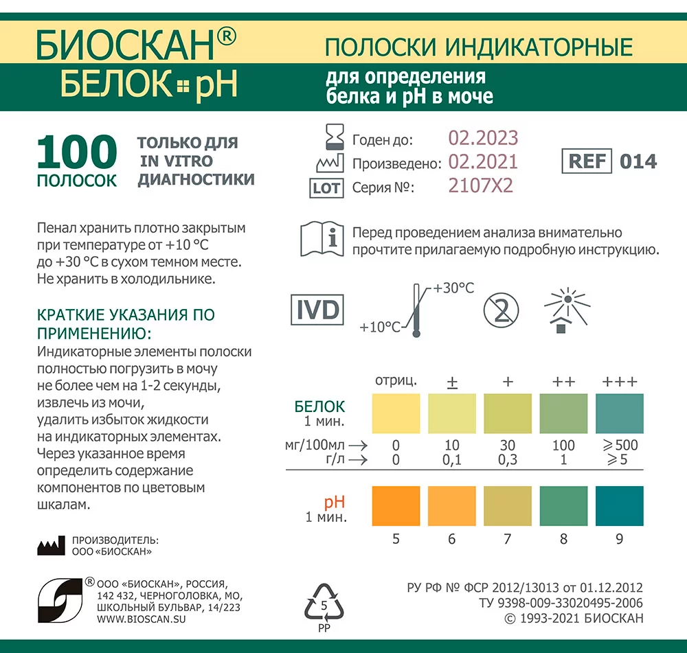 - В моче здоровых лиц белок, как правило, присутствует лишь в незначительных количествах (до 0,04 г/л). Ложноположительные результаты при анализе могут иметь место в случае сильно щелочной мочи (с рН выше 8) или мочи с исключительно высокой буферной емкостью; при исследовании мочи с высоким удельным весом; в случае присутствия в моче в качестве примеси поливинилпирролидона (одного из компонентов заменителя крови), а также могут быть вызваны загрязненностью посуды для сбора мочи следами моющих или дезинфицирующих средств на основе четвертичных аммониевых солей или хлоргексидина.