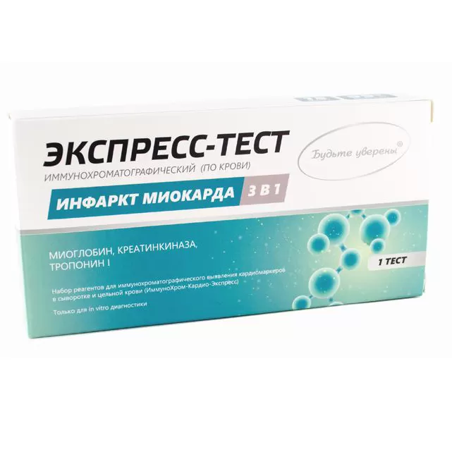 Экспресс диагностика инфаркта (выявление специфичных кардиомаркеров). Тест «ИммуноХром-Кардио-Экспресс» (3 в 1) представляет собой набор реагентов для быстрого одноэтапного качественного in vitro выявления кардиомаркеров (тропонина I (сТnI), креатинкиназы (CK-MB) и миоглобина (Myo)) в сыворотке и цельной крови человека.