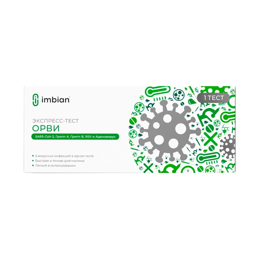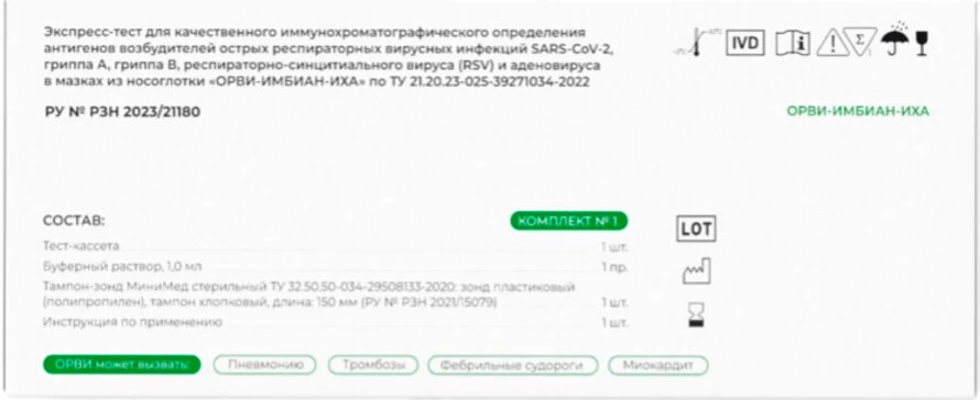 - Экспресс-тест для качественного иммунохроматографического определения антигенов возбудителей острых респираторных вирусных инфекций SARS-CoV-2, гриппа А, гриппа В, респираторно-синцитиального вируса (RSV) и аденовируса в мазках из носоглотки.