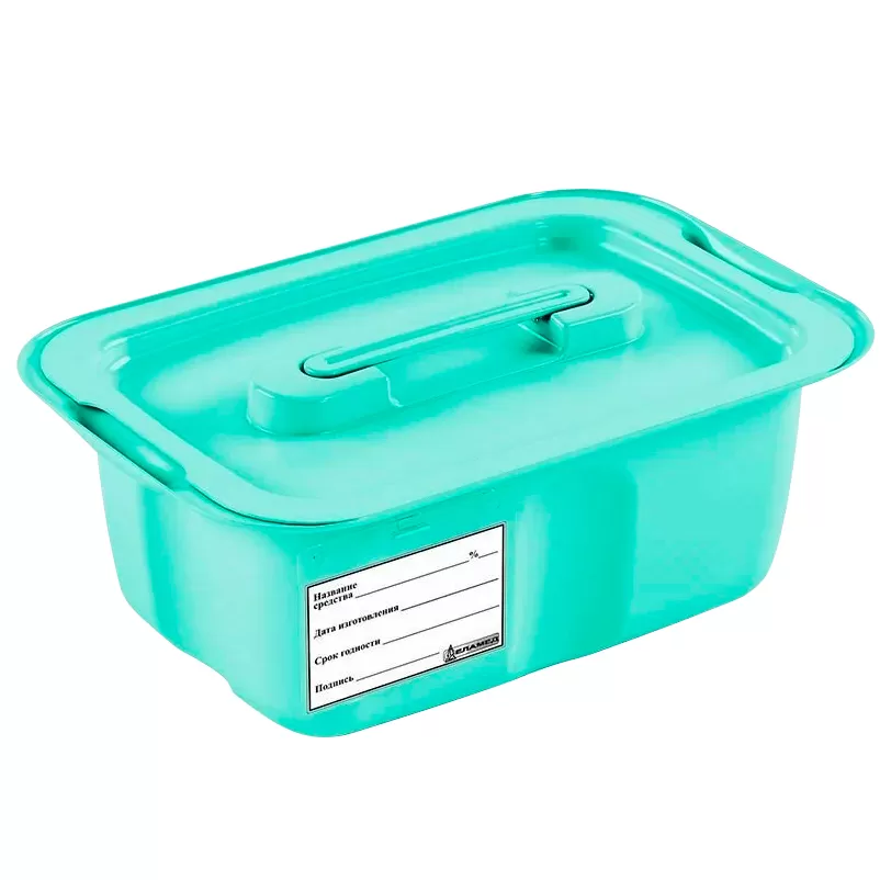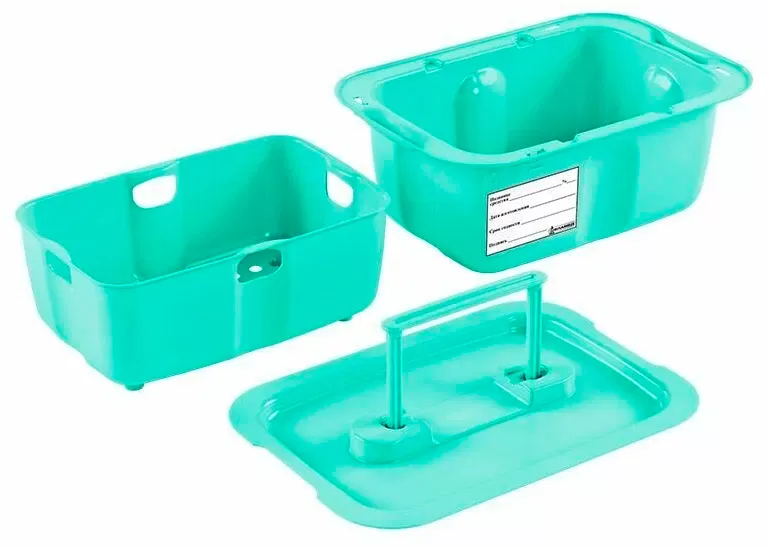 - Емкость-контейнер изготовлен из устойчивого к воздействию моющих и дезинфицирующих растворов полипропилена бирюзового цвета.