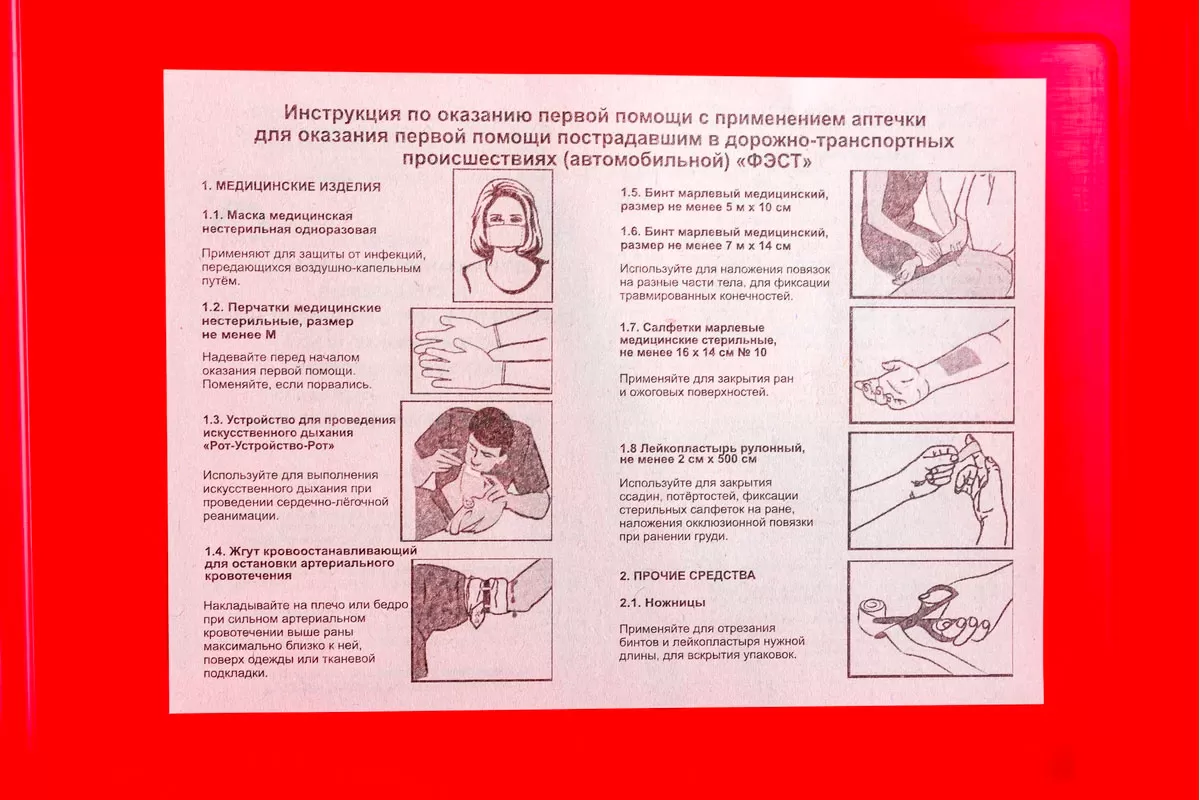 - Инструкция по оказанию первой помощи с использованием аптечки для оказания первой помощи с применением медицинских изделий пострадавшим в дорожно-транспортных происшествиях (автомобильной) - 1 шт.