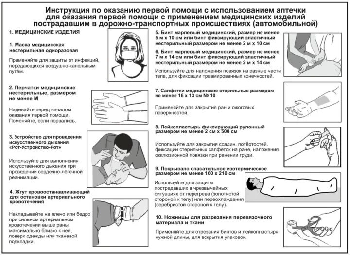 - Инструкция по оказанию первой помощи с использованием аптечки для оказания первой помощи с применением медицинских изделий пострадавшим в дорожно-транспортных происшествиях (автомобильной) - 1 шт.