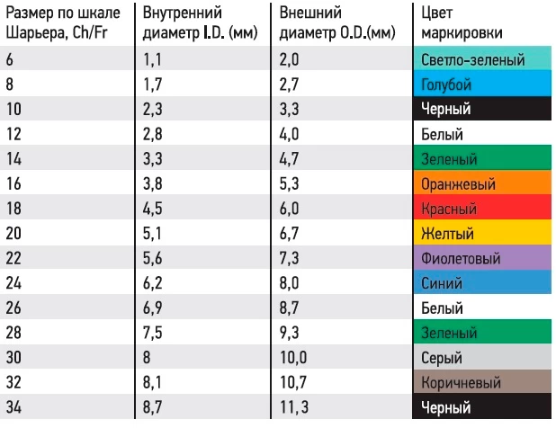 - Цвет коннектора можно определить по приложенной таблице (размер катетера по шкале Шарьера).