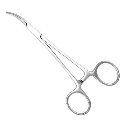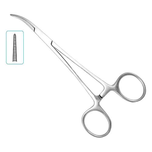 Зажим имеет тонкие бранши, на которые нанесена насечка. Рабочие губки изогнутые по ребру. Зажим снабжен зубчатым фиксатором - кремальерой.