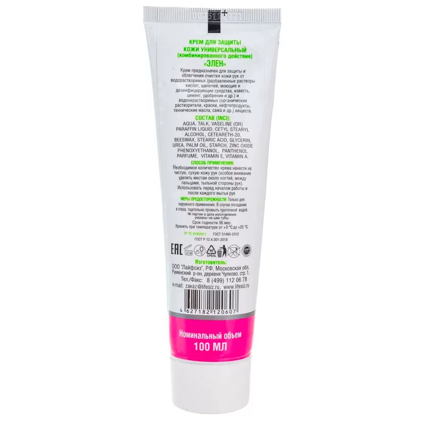 - Защитный универсальный крем ЭЛЕН 100 мл обеспечивает надежную защиту от любых загрязнений и бережный уход за кожей рук.