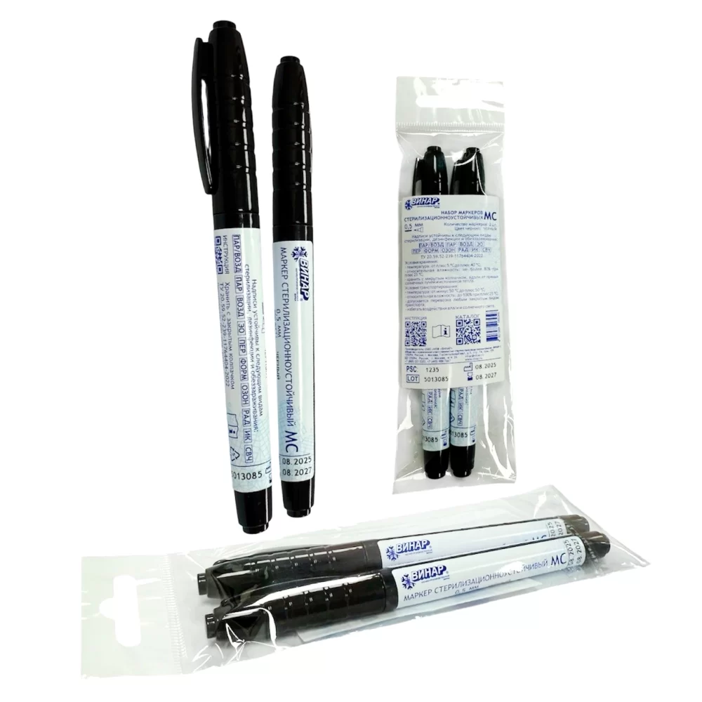 - Надписи, сделанные маркером МС, устойчивы ко всем видам процедур стерилизации (паровой, воздушной, газовой, плазменной, химической и пр.), а также к многократным циклам дезинфекции и обеззараживания. Маркировка не стирается, не выцветает и сохраняет четкость на протяжении всего срока хранения.