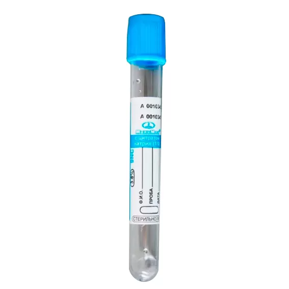 Пробирка содержит буферный раствор цитрата натрия, который является антикоагулянтом. Соотношение цитрата к количеству забираемой крови 1:9.