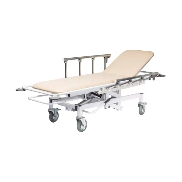 - Тележка для перевозки больных, оборудованная гидроприводной регулировкой высоты, поднимающимся изголовьем и боковыми ограждениями.