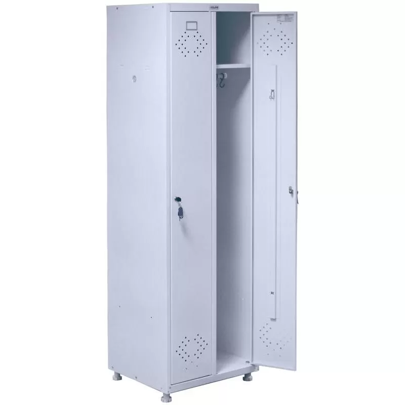 Шкаф поставляется в разобранном виде, в комплект поставки входят четыре регулируемые опоры (высота 100 мм, диапазон регулировки 95-125 мм). Возможные опции - комплектация замком PL (вместо ключевого замка устанавливается бесключевой замок Euro-locks A129 с устройством под навесной замок). Высота без установленных ножек 1830 мм.