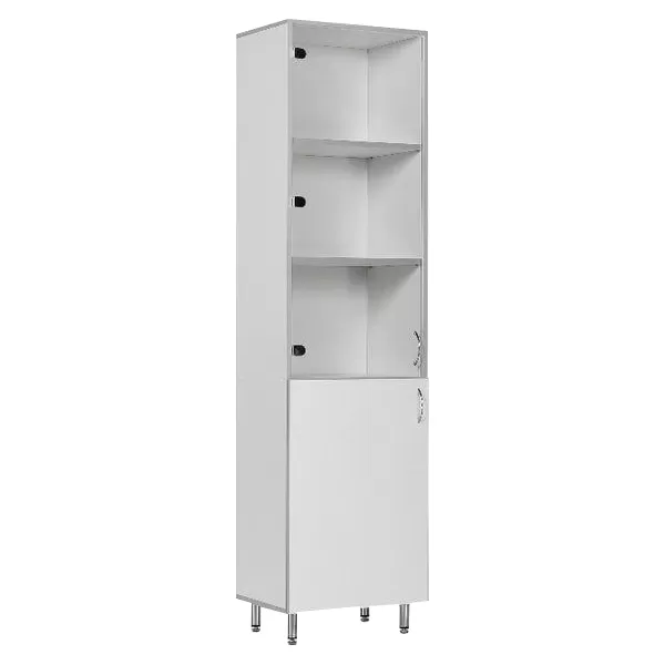 - Два отделения: верхнее - 2 съёмные полки, стеклянная дверка из травмобезопасного прозрачного стекла; нижнее - 1 полка, дверка ЛДСП.