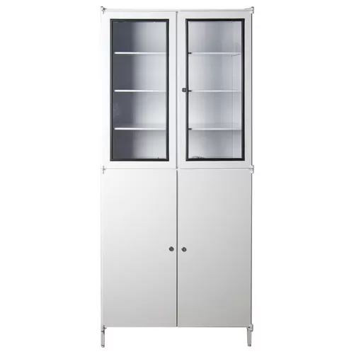 - Две верхние двери шкафа состоят из стекла, установленного в металлическое обрамление через резиновый уплотнитель с замком. Двери имеют замки.