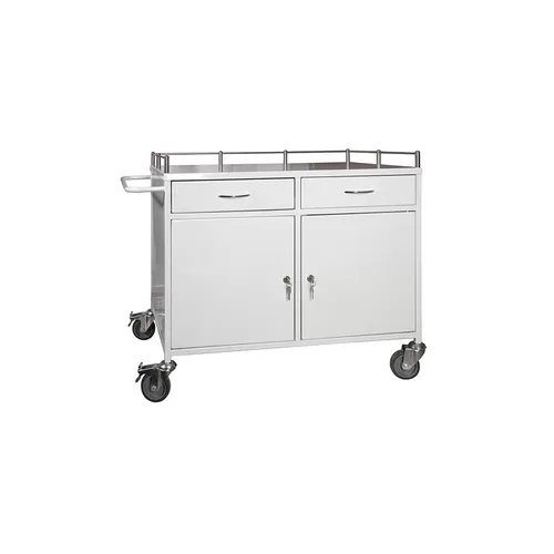 Столик имеет два выдвижных ящика, два отделения, которые закрываются дверцами с замками. Каждое отделение имеет полку. Столешница выполнена из нержавеющей стали 1,5 мм и имеет ограждения с трех сторон. Детали ограждения выполнены из нержавеющего прутка. Для передвижения столик имеет ручку.