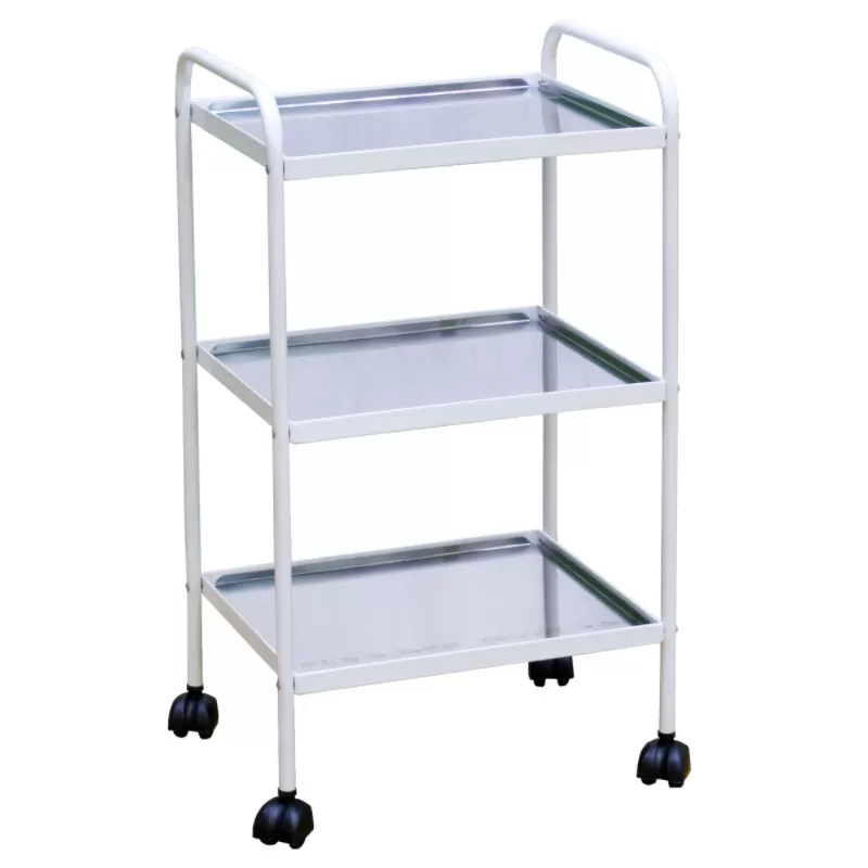 - Столик представляет собой разборную металлическую конструкцию, выполненную в виде каркаса на колесных опорах и 3 полок, изготовленных из нержавеющей стали.