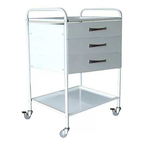 Столик представляет собой сварную металлическую конструкцию, выполненную в виде каркаса, 2 съемных полок из нержавеющей стали и 3 выдвижных ящиков.