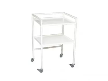Каркас столика покрыт полимерно-порошковым покрытием белого цвета. Стол имеет четыре колесные опоры (d = 50мм), два из которых оснащены тормозным устройством.