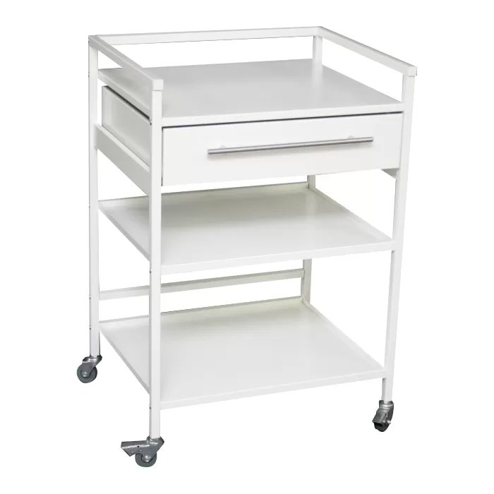 Каркас столика покрыт полимерно-порошковым покрытием белого цвета. Стол имеет четыре колесные опоры (d = 50 мм), две из которых оснащены тормозным устройством.