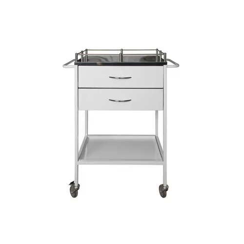 Столик состоит из каркаса двух выдвижных ящиков с ручками, съемного поддона и столешницы с ограждением.