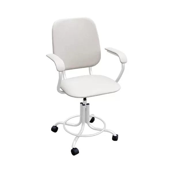 Стул винтовой, с мягким регулируемым по высоте сиденьем, мягкой широкой спинкой и с подлокотниками.