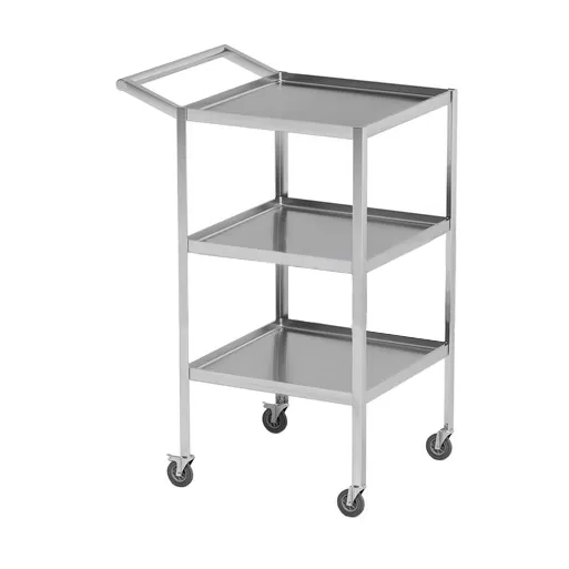 Каркас: нержавеющая сталь. Полки: 3 с отбортовкой. Колеса: 4 колеса диаметром 50 мм (2 колеса с тормозом), серая резина. Габаритные размеры: 400х400х880 мм.