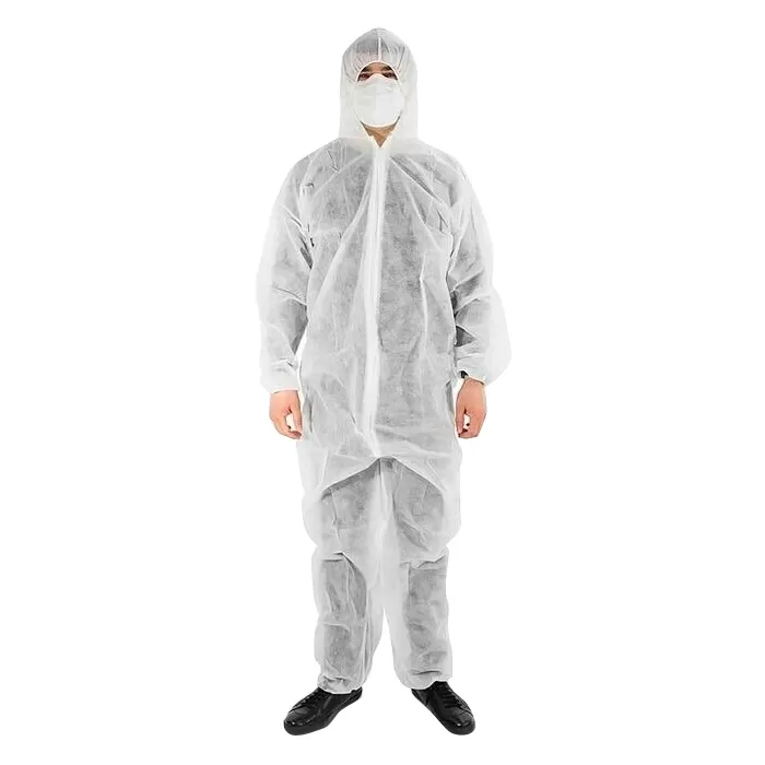 Одноразовый комбинезон сшит с использованием утягивающих резинок на запястье, нижней части брюк и на капюшоне, оснащен застежкой-молнией.
