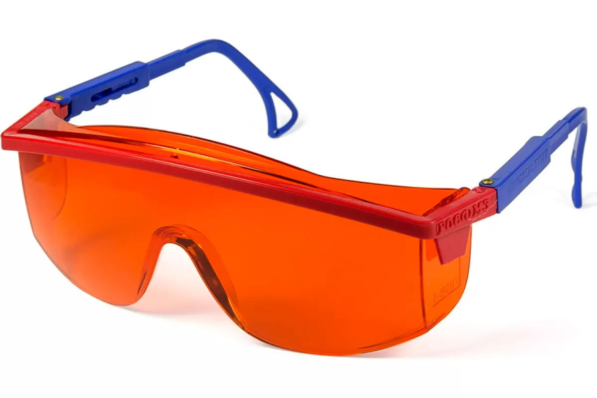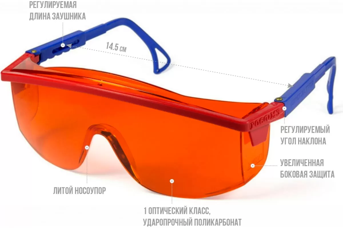 - Защитное стекло обеспечивает защиту от УФ-излучения до 570 нм, высокоскоростных частиц, капель жидкостей, оптического излучения.
