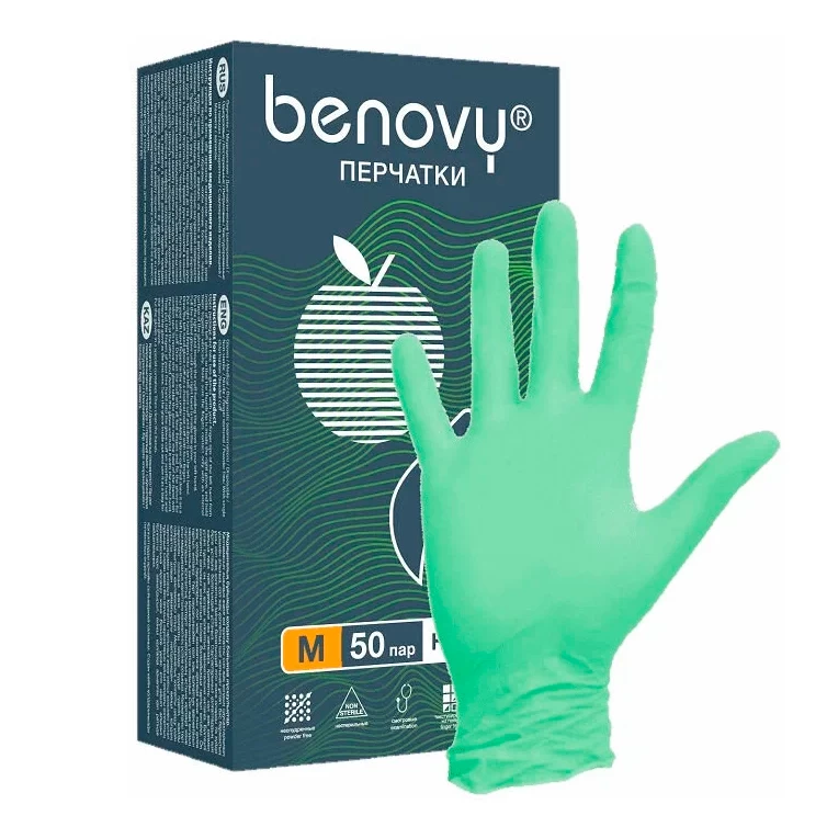 - Нитриловые смотровые перчатки Benovy зеленого цвета – это современное средство защиты, обладающее высокой прочностью и устойчивостью к воздействию агрессивных веществ.