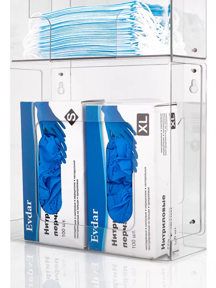 - Органайзер для одноразовых СИЗ Evdar настенный позволяет вместить: 2 упаковки перчаток, 2 вида СИЗ, медицинские маски.