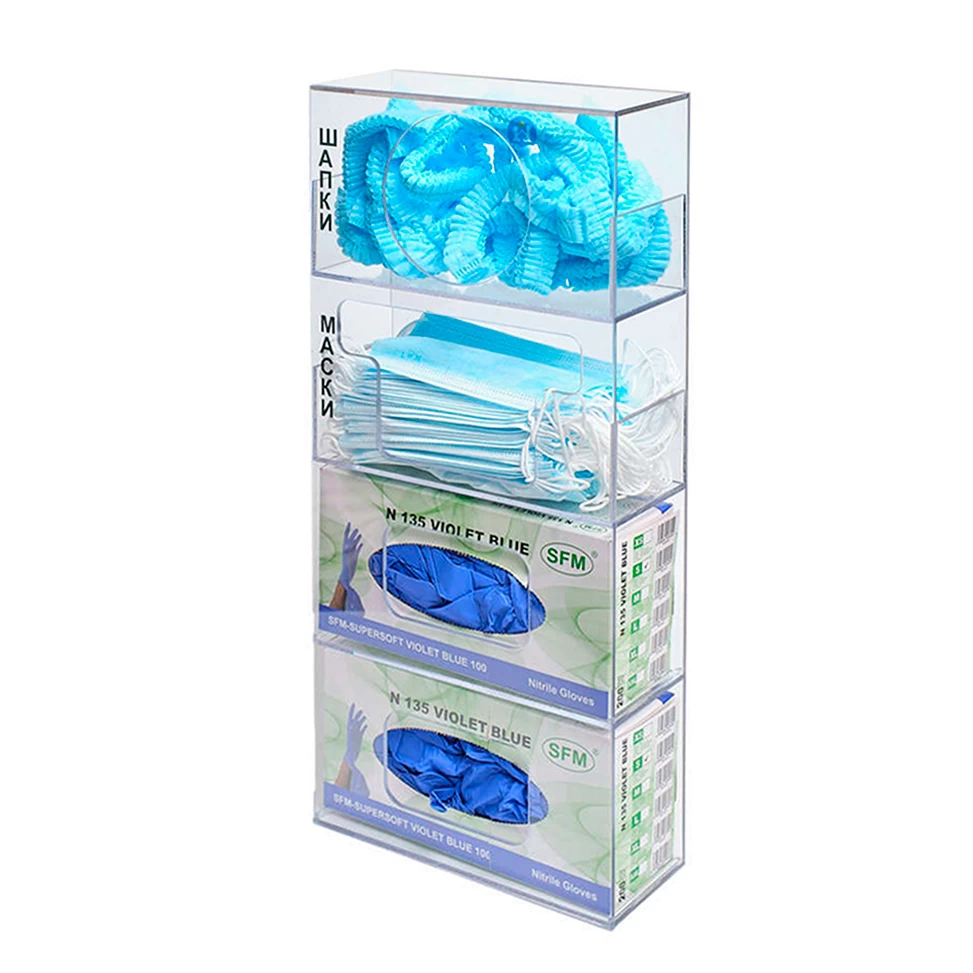 - 2 отсека для коробок перчаток, 1 отсек для медицинских шапок (с круглым отверстием), 1 отсек для медицинских масок (с широким отверстием).
