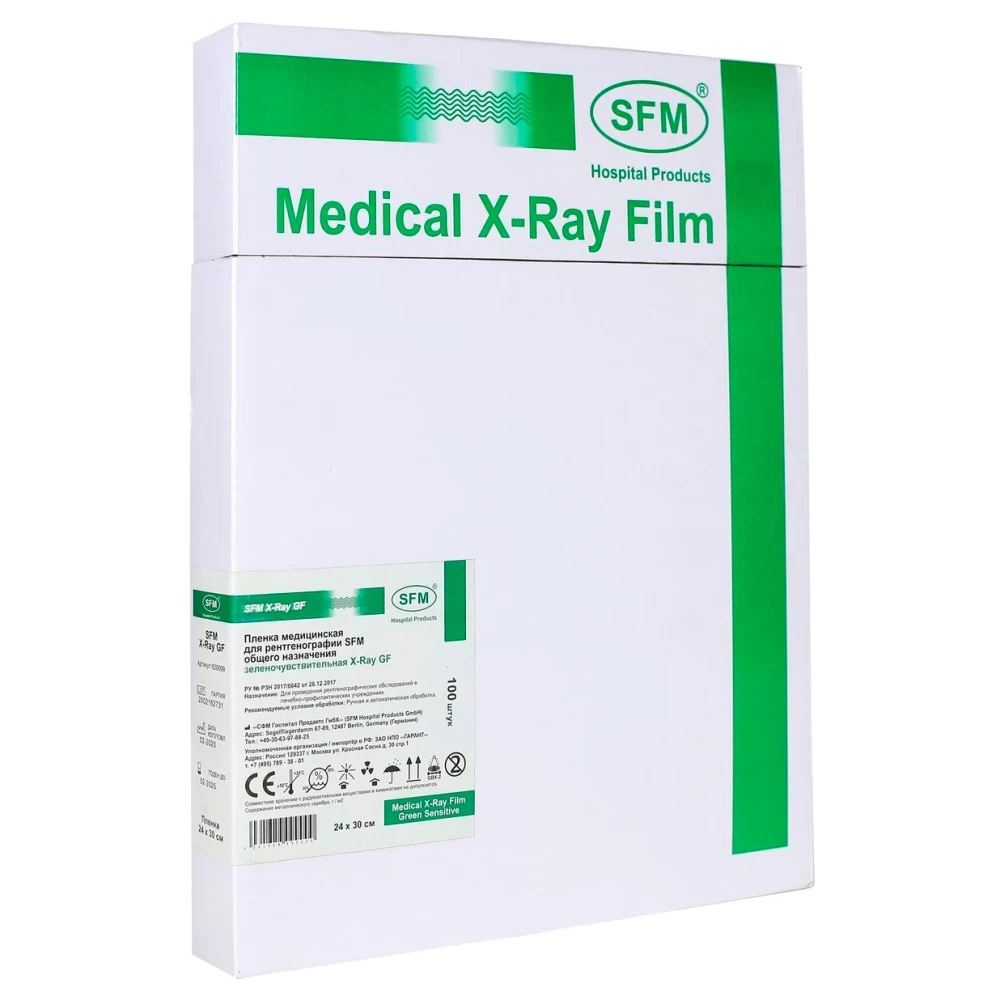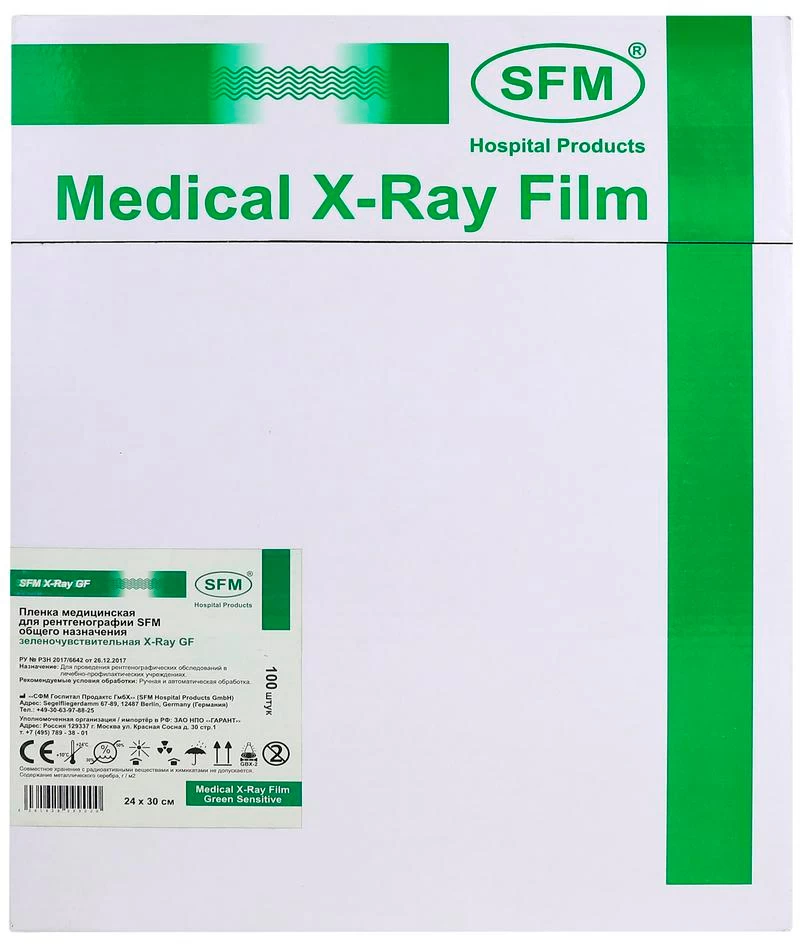 - Зеленочувствительная медицинская рентгеновская пленка SFM X-ray GF рекомендуемая к применению с люминесцентными ортохроматическими усиливающими экранами, является двухсторонне эмульсированный фотографическим материалом, сенсибилизированный в зеленой части спектра.
