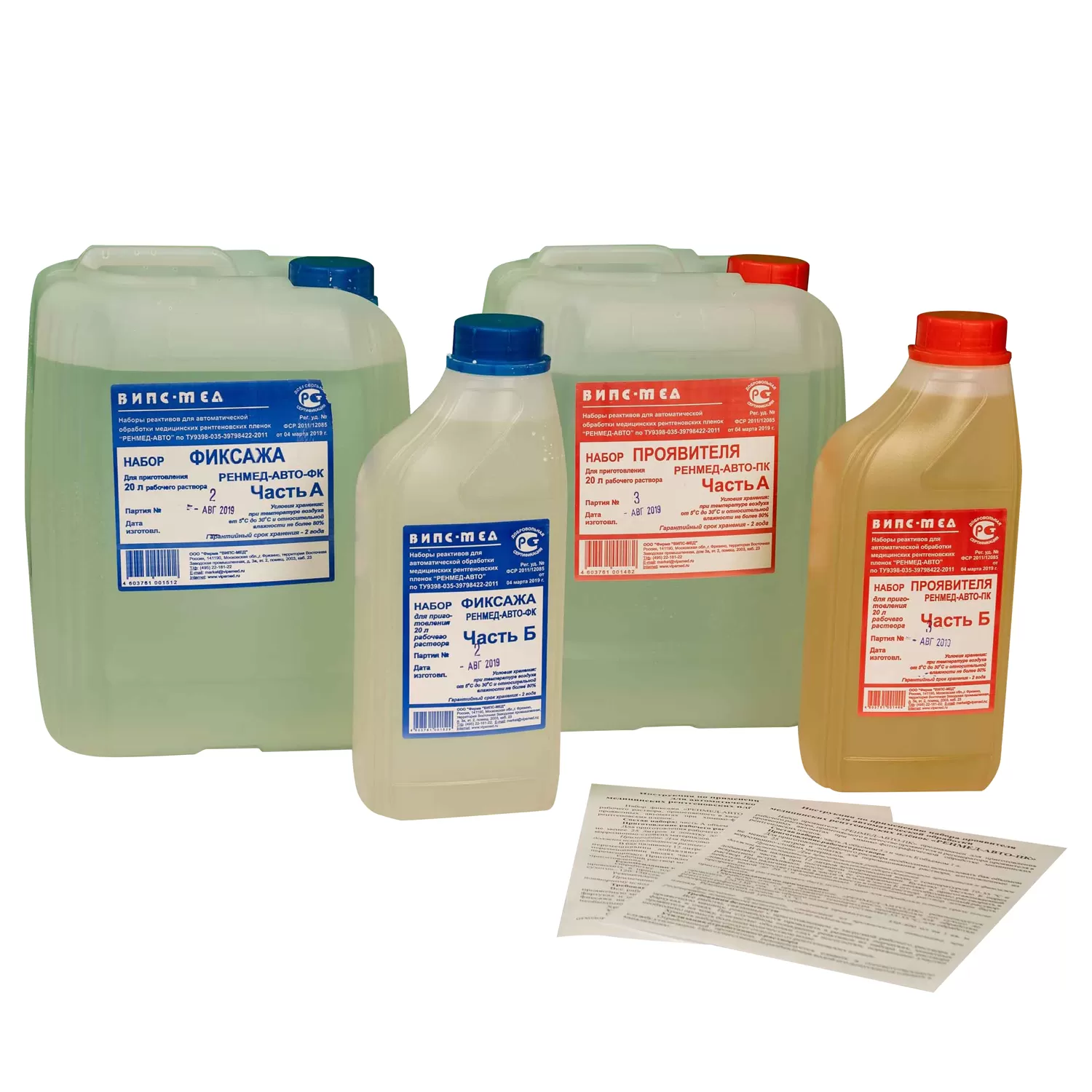 Набор проявителя «РЕНМЕД-АВТО-ПК-3», выпускаемый по ТУ 20.59.12-047-39798422-2019, регистрационное удостоверение № РЗН 2020/12559 от 16.11.2020, состоит из трех концентрированных растворов в герметичных пластиковых канистрах емкостью 5 л (часть 1), 0,5 л (часть 2) и 0,5 л (часть 3).