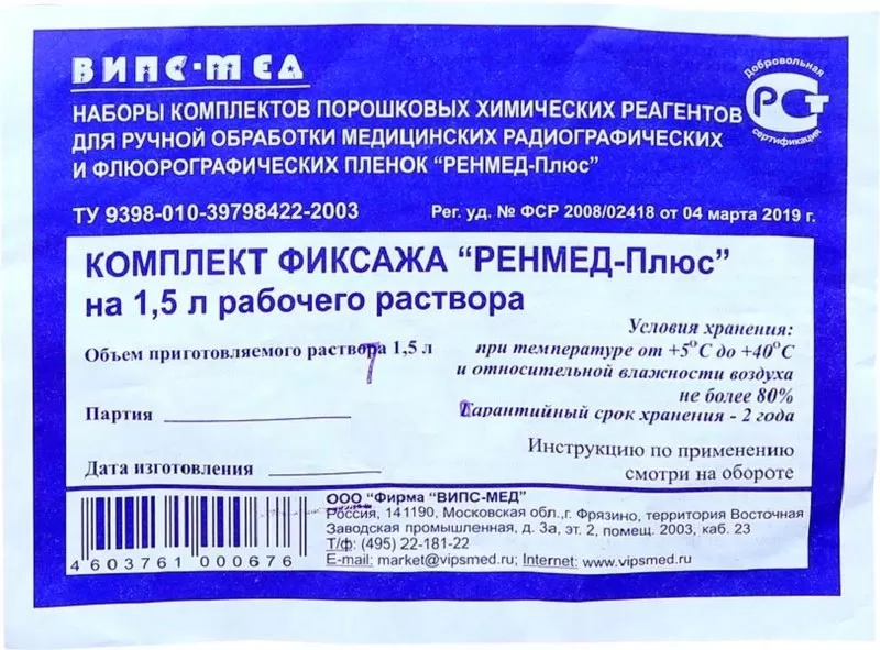 - Используется для приготовления 1,5 л рабочего раствора фиксажа.