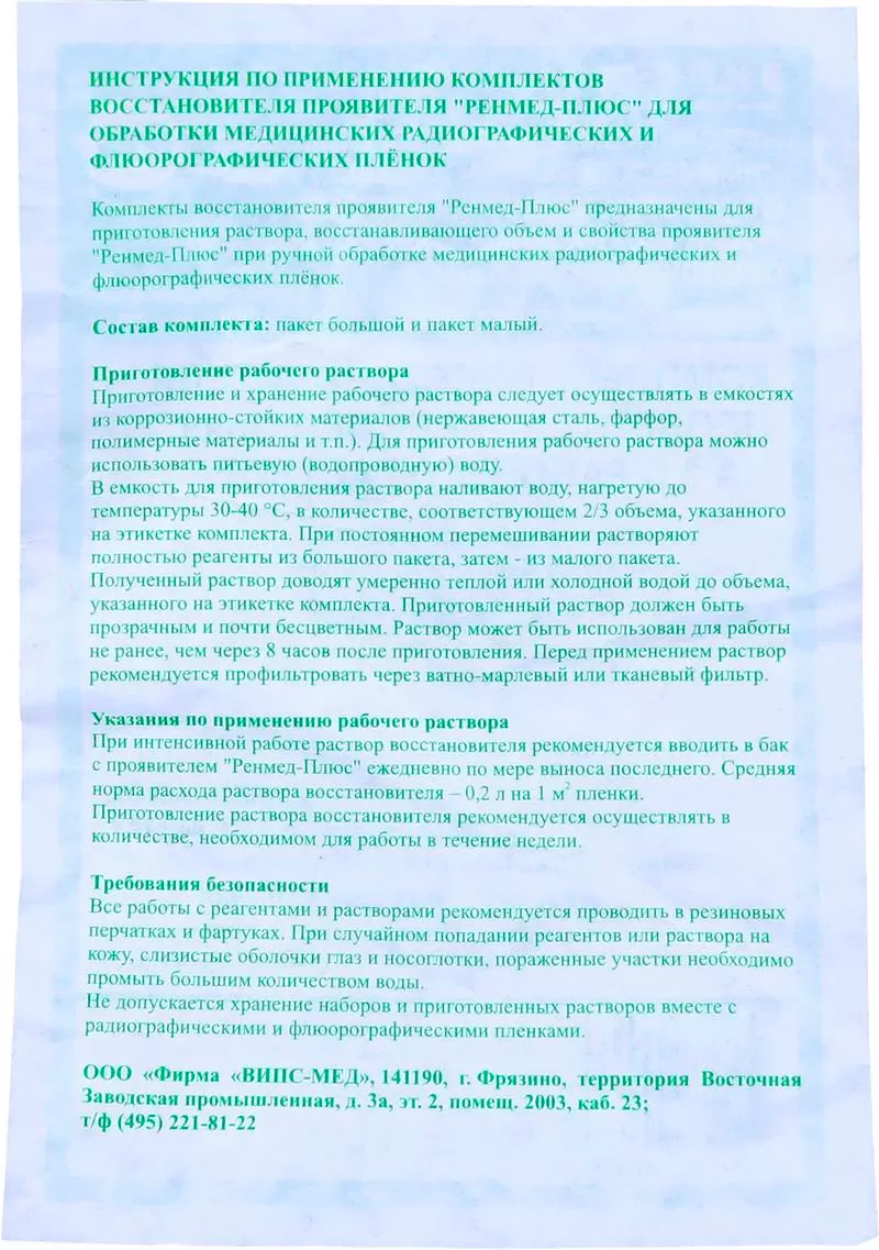 - Один литр раствора используется для проявления 2 кв.м рентгеновской или флюорографической пленки в условиях регулярного добавления в жидкость восстановителя.