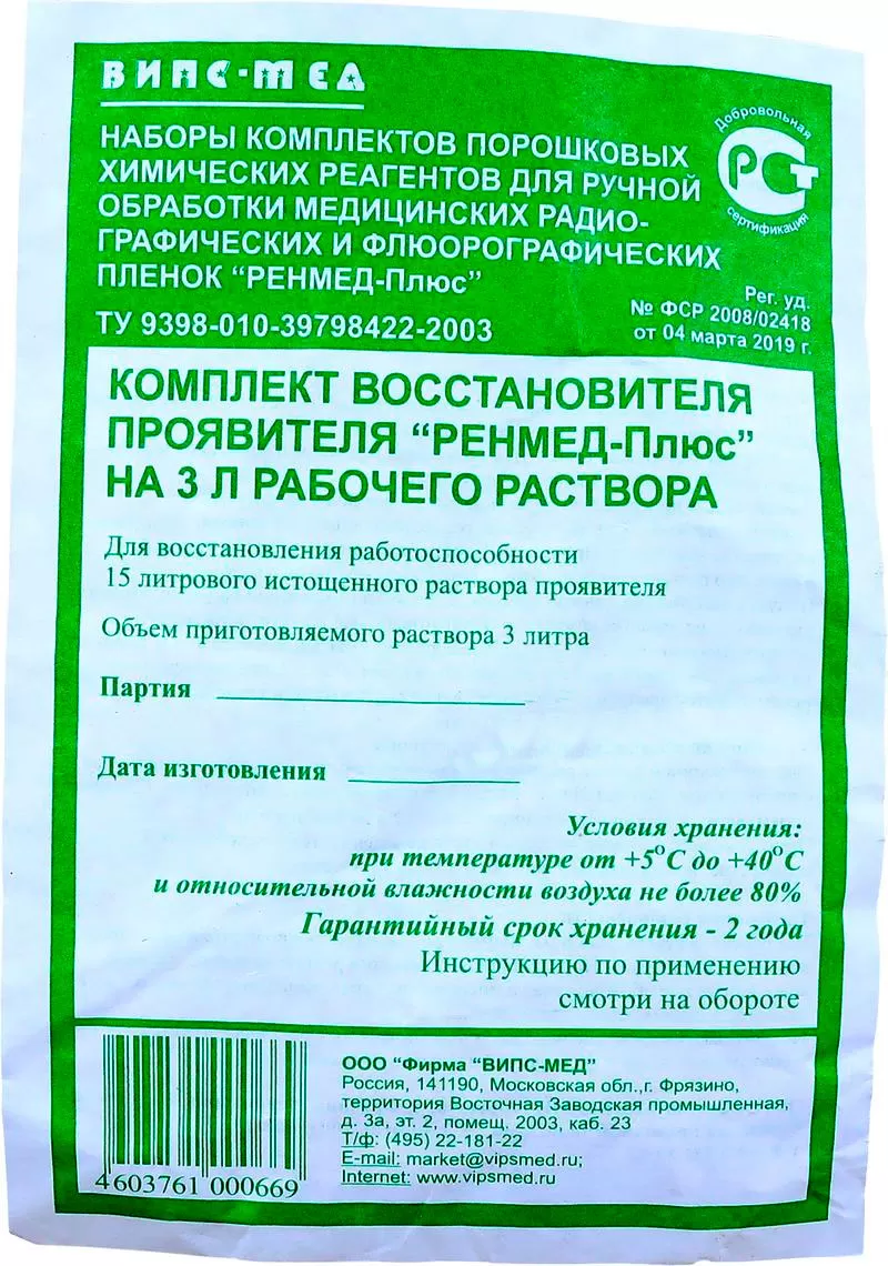 - Для приготовления рабочего раствора из химия ручной ""Ренмед-Плюс""на 15 л. используется обычная водопроводная вода. Обработка проявителем занимает 3-4 минуты (при температуре 23°С).