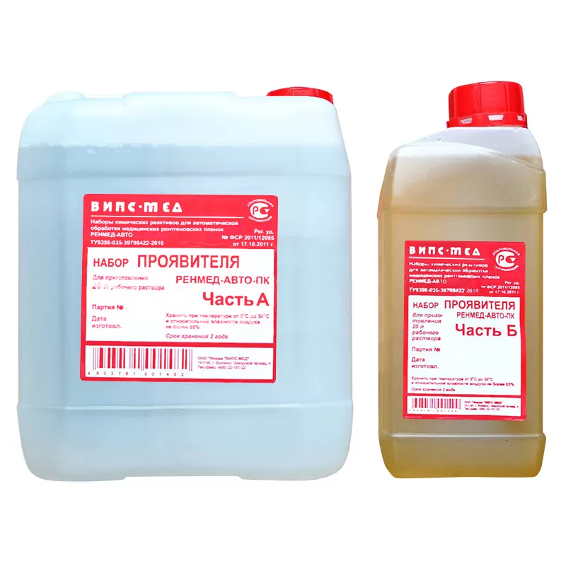 - Наборы проявителя «Ренмед-Авто-ПК» представляют собой концентрированные растворы в герметичных полиэтиленовых канистрах емкостью 5 л (часть А) и 1 л (часть Б) и выпускаются в комплектах по 2 набора проявителя и фиксажа.