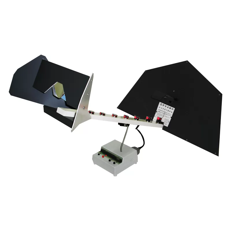 - Оптическая сила линз (8 шт) от -3,0 до 3,0 диоптрии. Линза зафиксированы на индивидуальных кронштейнах; имеется короб для сменных линз.