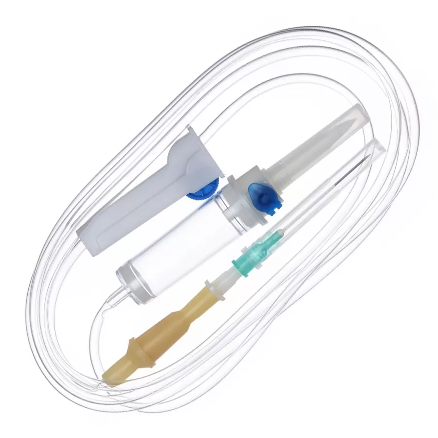 - длинная гибкая трубка, роликовый регулятор течения, латексный порт для дополнительных инъекций;