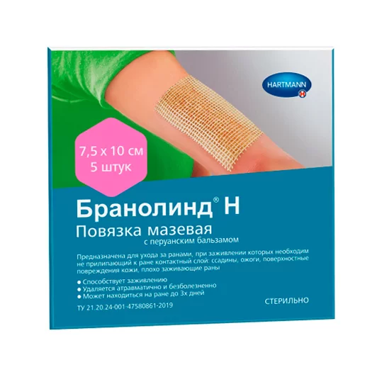 - Повязка «Бранолинд Н» с перуанским бальзамом обладает ранозаживляющими свойствами. Компоненты мази обеспечивают также антисептическое воздействие, предотвращая развитие вторичных инфекций. В случае обширного отделения экссудата перевязку можно менять до трех раз в сутки, в остальных случаях повязку следует менять раз в день.