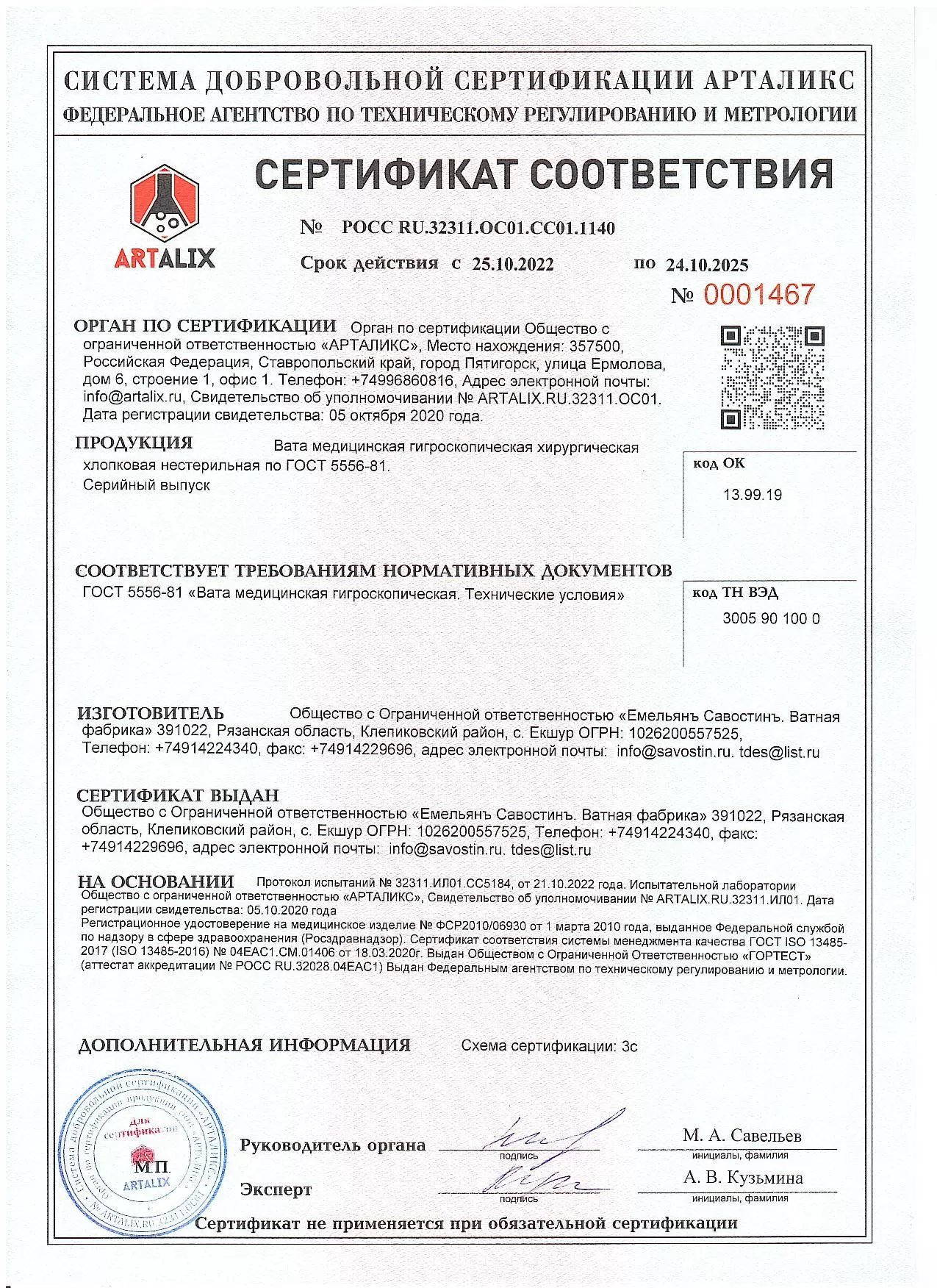 - Отбеливание ваты производится в соответствии требованиям ГОСТа 5556-81 (без использования хлора и его компонентов).